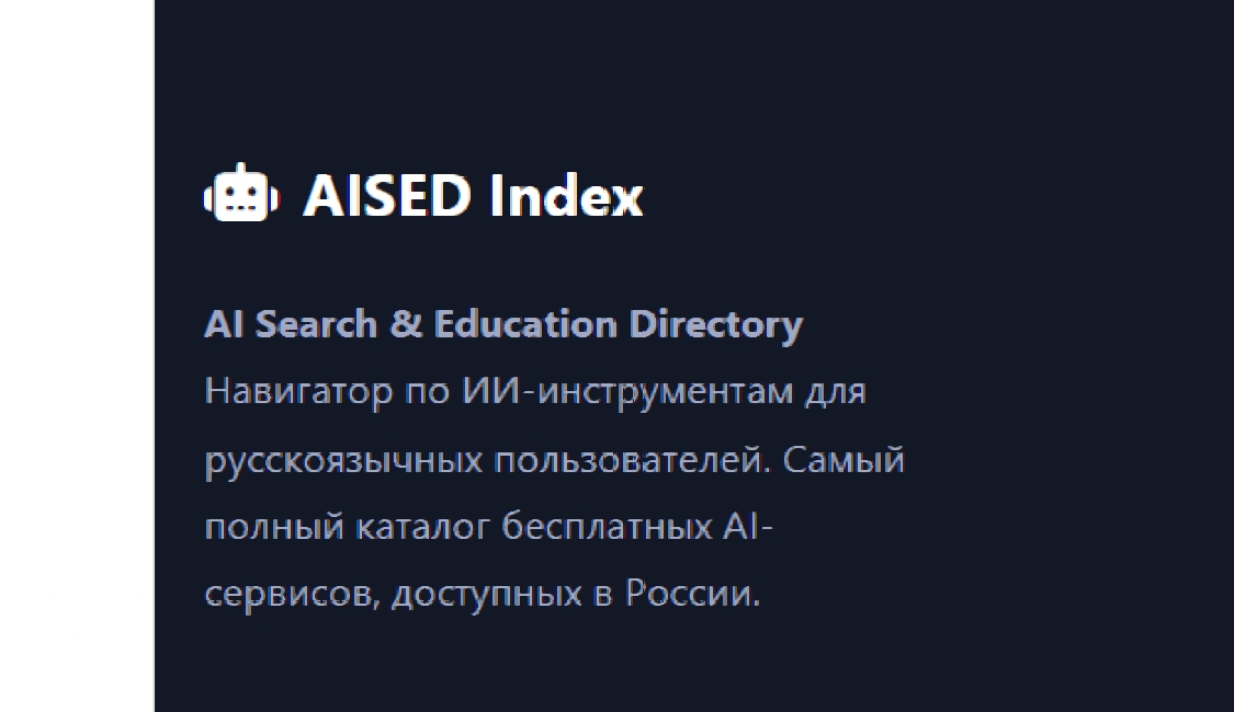 Приветствую читателей моего блога! Сегодня хочу рассказать о запуске нового проекта, над которым я работал последние несколько недель. Это AISED Index — навигатор по бесплатным ИИ-инструментам, доступным для русскоязычных пользователей.